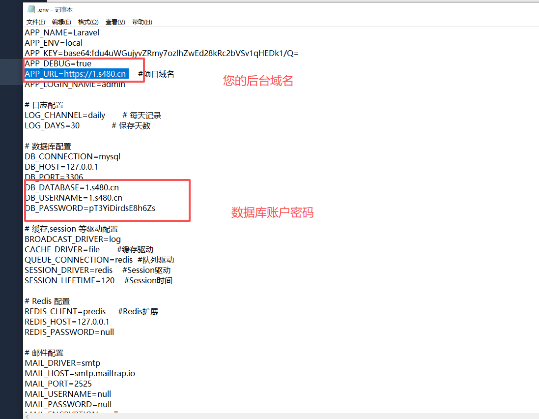 找到后端文件 .env 文件在根目录下面 打开.env文件 找到 APP_URL=https://1.s480.cn 改成您的域名 然后改数据库账户密码 也是在.env文件里面 DB_CONNECTION=mysql