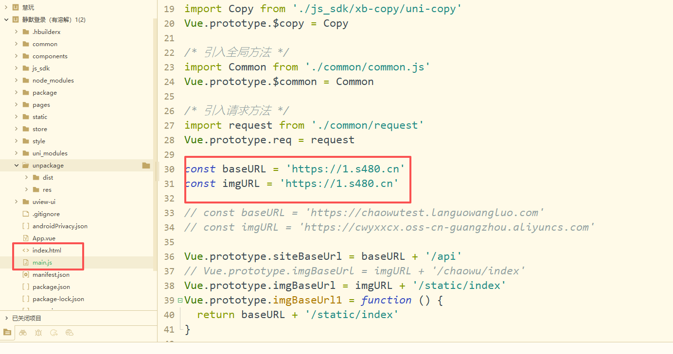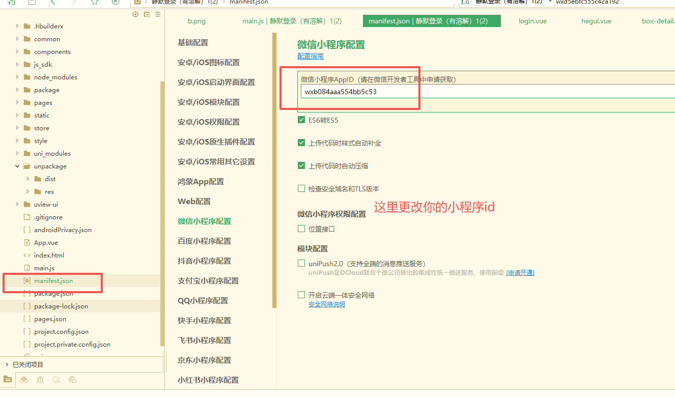 使用 HBuilder X 打开 ,找到 manifest.json 更改成为您的小程序id,更改完成以后 找到 main.js 30行到31行
